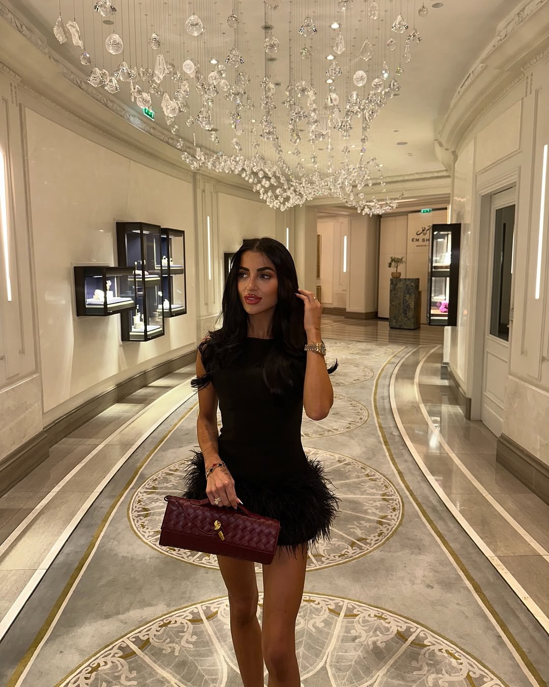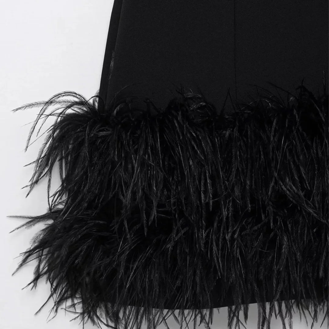 Erlebe pure Eleganz mit unserem atemberaubenden ärmellosen Kleid, das mit seinem exquisiten Federsaum alle Blicke auf sich zieht. Dieses luxuriöse Kleid vereint zeitlose Schönheit mit modernem Glamour und ist die perfekte Wahl für besondere Anlässe wie Cocktailpartys, elegante Abendveranstaltungen oder stilvolle Dinner-Dates.